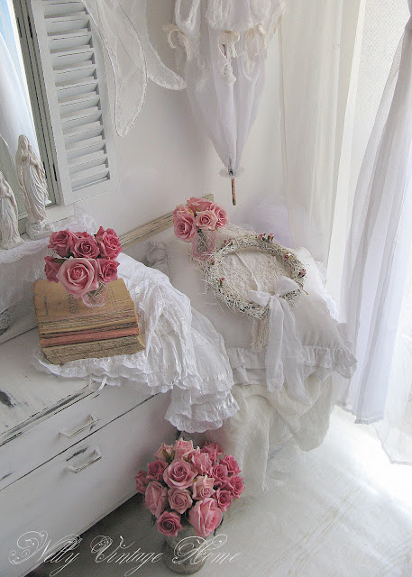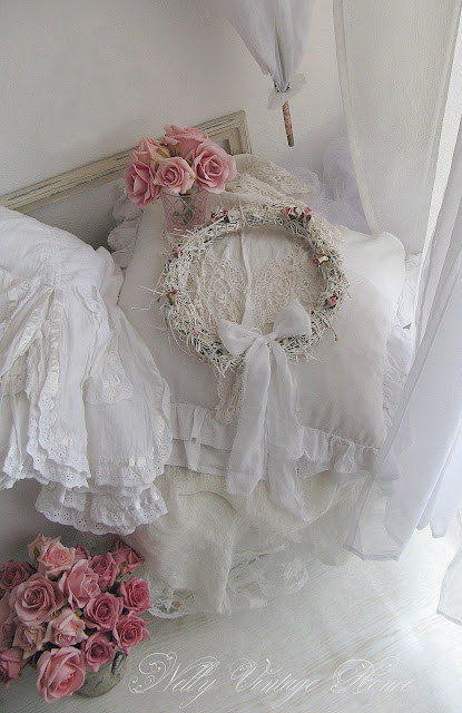 ОтговорИзтриванеYour flowers are wonderful, even not real, and the white wreath is so gorgeous , as is also the old books in white and pink. Every post from you are stunning, and so extra beautiful, dear Nelly.