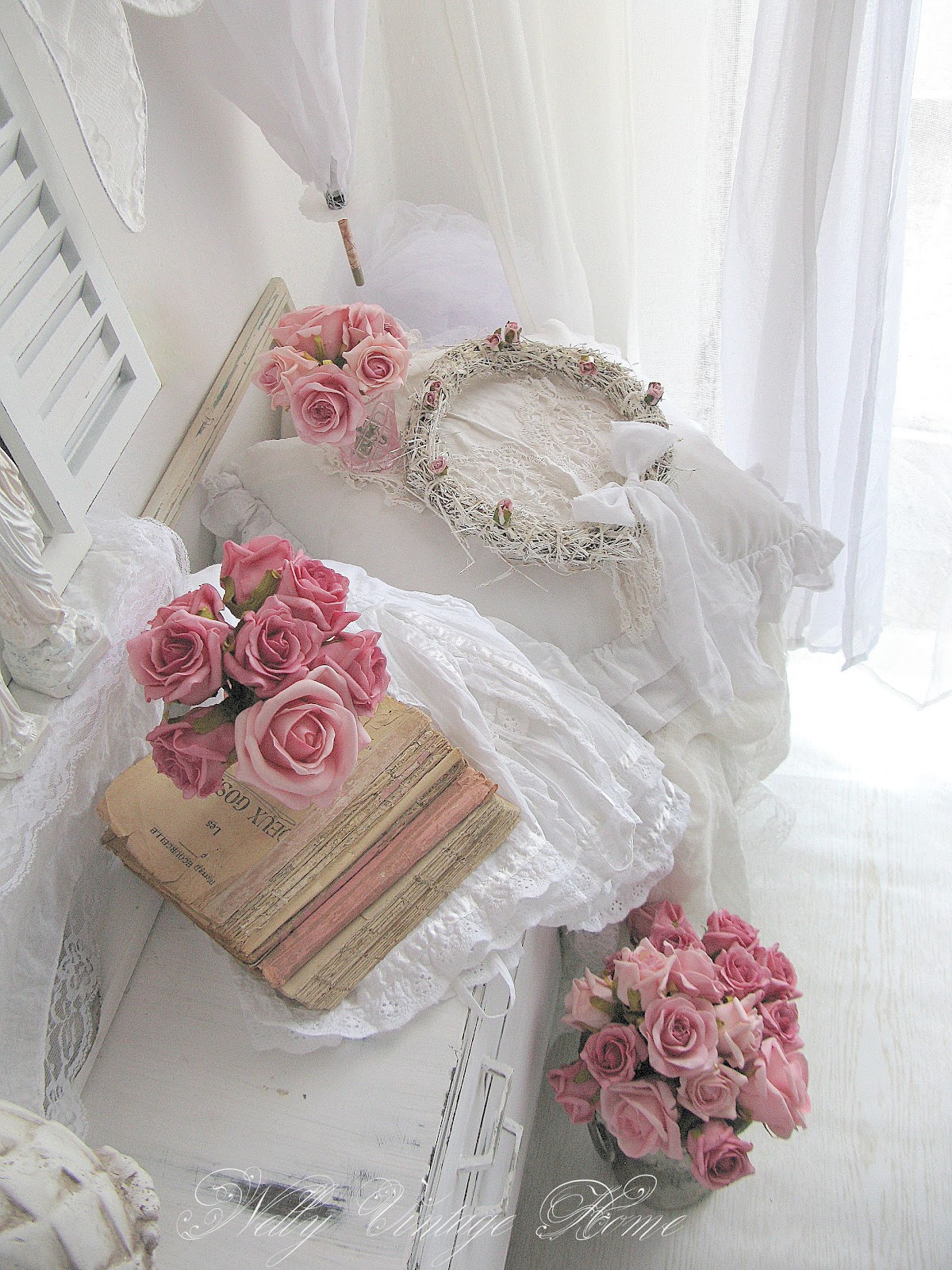 ОтговорИзтриванеYour flowers are wonderful, even not real, and the white wreath is so gorgeous , as is also the old books in white and pink. Every post from you are stunning, and so extra beautiful, dear Nelly.